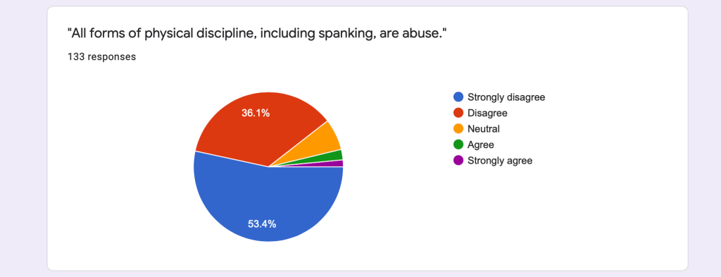 This question was designed to help me determine which respondents have extreme ideological views. Those who hold to the idea that all spanking is abuse put 80% of the world in the category of an abuser. This is quite extreme. Only two respondents Strongly Agreed with this statement. Three Agreed with this statement, nine were neutral, and rest either Disagreed or Strongly disagreed.