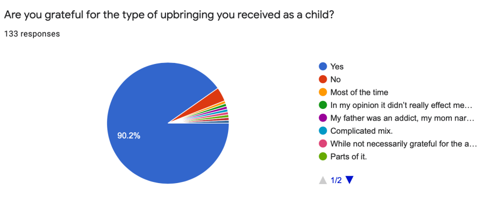 This question was designed to gauge how each respondent felt about their childhood upbringing. Surprisingly, only seven of the thirteen respondents who counted themselves as victims of abuse said no, that they were not grateful. Otherwise, 90% said they were grateful for their upbringing, with some mixed responses besides that.